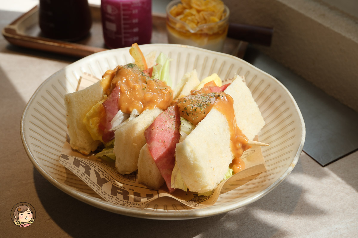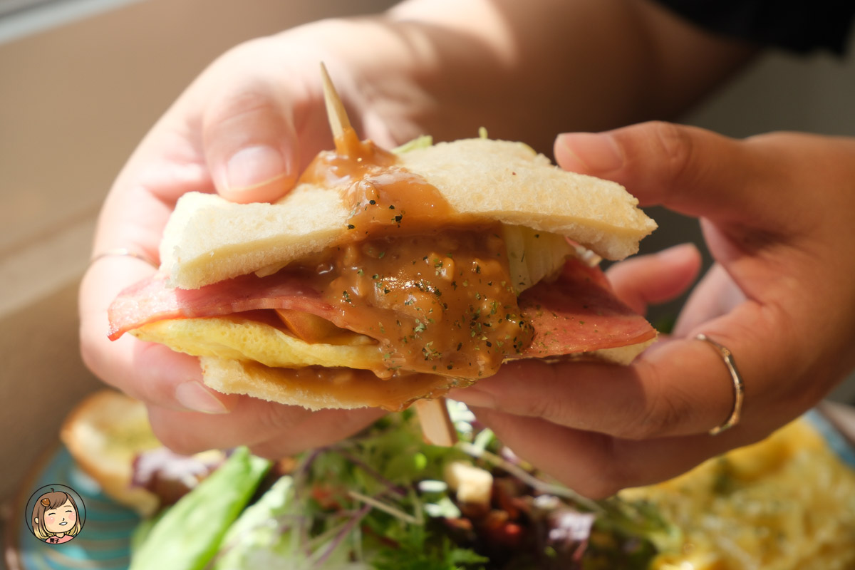 一上桌就聞到花生香,整份三明治夾著爆出來的顆粒花生醬,搭配鹹香培根,鹹甜交織的滋味讓人一咬就上癮
