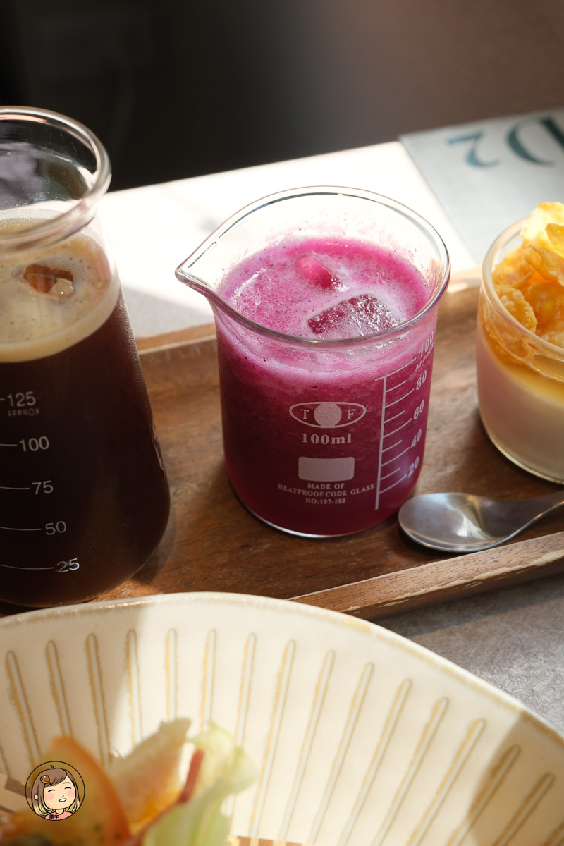 火龍果汁清爽順口、美式咖啡醇香提神,還有一小碗原味優格,甜甜的健康感作結,讓整份早午餐畫上完美句點