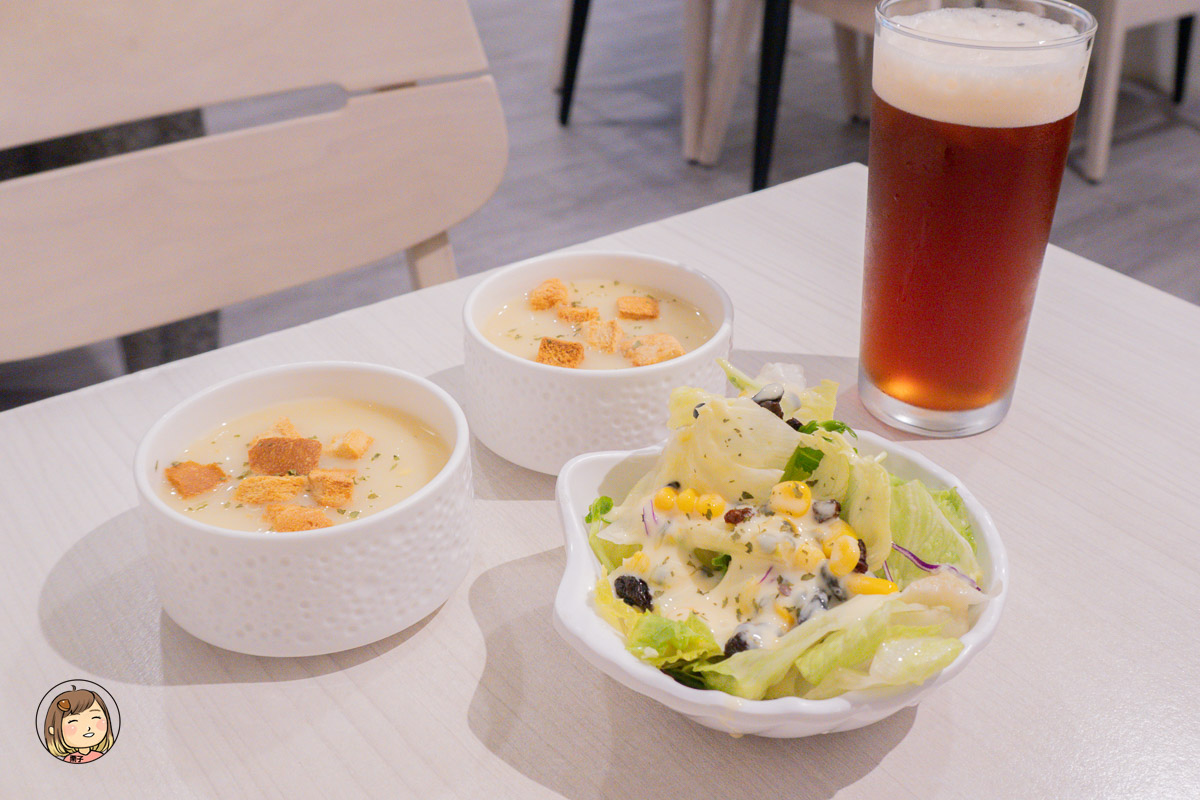 如果想吃得更完整,可以加價 80 元升級套餐,附上生菜沙拉(可選醬料,我選了爽口的優格醬)、濃湯,整體更加滿足。湯品口感濃郁,這個組合在許多餐廳都要150元起跳,這裡只要80元真的很佛!